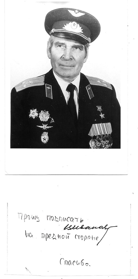 IVANOV, Viktor. Fighter pilot, U.S.S.R. Ace credited with 30 victories. Photograph, B&W, 3.5”X5”, head & shoulders pose in uniform wearing his medals. Signed on the verso. In fine condition.................$110.00