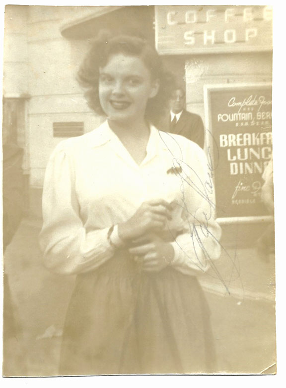 GARLAND, Judy (1922-1969). Favorite American actress who received a special Oscar for her performance as “Dorothy” in the Wizard of Oz. Original one of a kind snapshot taken with a Brownie camera most likely in the forties. A young somewhat chubby Garland, half-length pose taken in front of a coffee shop, Signed in full, contrast just good with signature entirely legible........$675.00