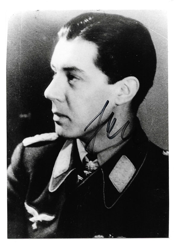 JABS, LT. Col. Hans-Joachim (1917-2003). German fighter pilot during WWII. He was a scarce daytime and night fighter pilot. Flew with the ZG-76 and NJG-1. Ace credited with 50 victories. Awarded the Knight’s Cross with Oak Leaves. Photograph, 3.5”x5”, B&W, head & shoulders pose in uniform. Boldly signed with good contrast. A very desirable signature and uncommon in signed photographs............................... $95.00 |