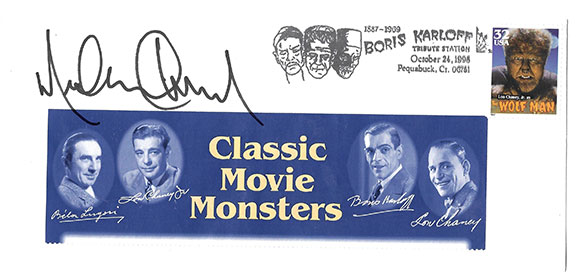 JACKSON, Michael (1958-2009). American singer, songwriter, record producer, dancer, and actor. Called “The King of Pop”. Winner of 13 Grammy Awards. His “Thriller” album was released in late 1982 and was the bestselling album of all time in the United States. Legal size cover, affixed is a U.S. 32 cent postage stamp of Lon Chaney, Jr. as Wolf Man. Postmarked with a rubber stamp portrait of Boris Karloff, Tribute Station, October 24, 1998, Pequabuck, Ct. 06781. Very boldly signed with a huge signature “Michael Jackson” in black Sharpie. A fantastic signature. Only 500 of these First Day Covers were created and signed by Michael Jackson commemorating Boris Karloff. This was for an upcoming project to commemorate the Thriller Anniversary. In very fine condition. Of the 500 signed covers only two were of this style with a seven-inch colorful label depicting Lugosi, Chaney Jr., Karloff and Lon Chaney..........................SOLD