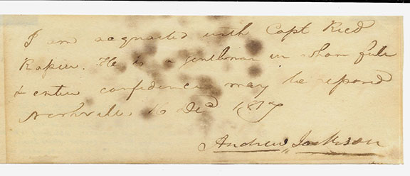 JACKSON, Andrew (1767-1845). The 7th President of the United States. General in the U.S. Army. He led forces in the first Seminole War which led to the annexation of Florida from Spain. Jackson signed the Indian Removal Act which forced relocation of most members of the native American Tribes in the South to Indian territory. On January 30, 1835 he survived the first assassination attempt on a sitting president while he was leaving a funeral. Autograph letter signed appx. 2.75”x8.” Jackson writes: “I am acquainted with Capt. Ricd (Richard) Rapier. He is a gentleman in whom full & entire confidence may he respond. Nashville, 16 Dec. 1817 Andrew Jackson. In December 1817, U.S. General Andrew Jackson was given command of U.S. forces in the area. In the following spring, he led troops against Seminole villages on Lake Miccosukee and along the Suwannee River, destroying them as he went. In addition, he seized the Spanish military post at what is now St. Marks and then proceeded to take the Spanish-held town of Pensacola. Jackson’s military successes paved the way for Spain’s agreement to relinquish its territory in Florida to the United States. Letter in V/G condition except for several spots of foxing................$1,250.00 ![]() |