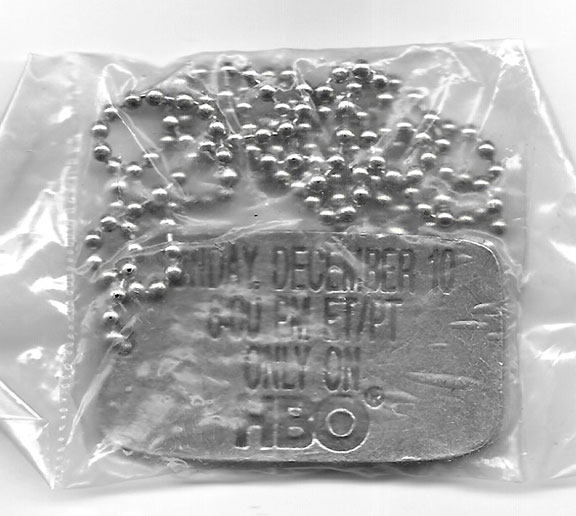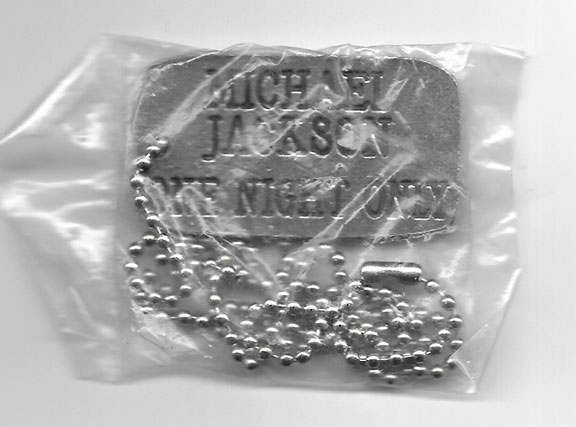 JACKSON, Michael (1958-2009). American singer, songwriter, actor and dancer. Very scarce HBO Dog Tag for “One Night Only” scheduled for broadcast, Sunday, Dec.10 (1995). The concert was cancelled due to the fact that Jackson collapsed onstage at the historic Beacon Theater in New York City on Dec. 6 while rehearsing for this special. He was hospitalized until Dec.13, These Dog Tags were to be handed out to members of the audience in exchange for their tickets. Michael Jackson ordered all the Dog Tag to be destroyed. This original Dog Tag comes with the original 24” chain and is still sealed in the original plastic bag......$95.00