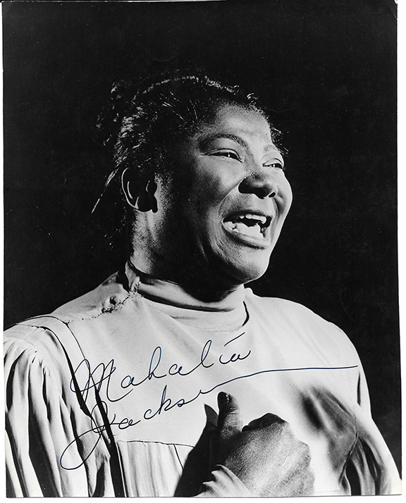 JACKSON, Mahalia (1911-1972). Noted Gospel singer and recording star since 1934. Eight of her records sold over 1 million copies. She sang on the radio during the 1950’s and performed at Carnegie Hall. She sang at the inauguration of John F. Kennedy 91961). She was closely associate with the Civil Rights Movement. Photograph, B&W, measures 7.5”x9.5”, head and shoulders pose, singing. Very boldly signed with a huge signature. Excellent contrast and in fine condition. Signed photographs of Mahalia Jackson seem to have all but disappeared from the market......................................SOLD