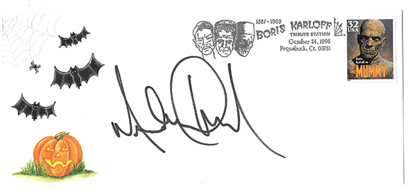JACKSON, Michael (1958-2009). American singer, songwriter, record producer, dancer and actor. Known around the world as the “King of Pop”. Once married to Lisa Marie Presley, his personal physician Conrad Murray was convicted of involuntary manslaughter with regard to Jackson’s death. The release of Jackson’s Thriller album was released late in 1982 and won him 7 Grammy Awards. Thriller was the best selling album in 1983. First Day Cover that commemorates Boris Karloff. Boris Karloff as “The Mummy” U.S. 32 cent stamp, postmarked “Boris Karloff Tribute Station, Oct. 24, 1998, Peqabuck, CT 06781. Color cachet of spider web, flying bats and a pumpkin. Hand signed with a fabulous bold signature of Michael Jackson. This is one of the covers that was made to an upcoming project to commemorate the Thriller anniversary...............................................SOLD