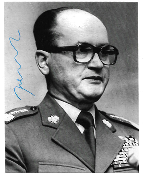 JARUZELSKI, Wojciech (1923-2014). Polish military officer and politician. He was the first Secretary of the Polish United Worker’s Party (1981-89) and as such was the last leader of the People’s Republic of Poland. He also served as Prime Minister from 1981 to 1985 and the country’s Head of State from 1985 to 1990 and as President from 1989 to 1990. He was also the last commander - in- chief of the Polish People’s Army. He was chiefly responsible for the imposition of martial law in Poland on Dec. 13, 1981 in an attempt to crush the pro-democracy movements. Thousands of journalists and opposition activists were jailed without charges and others lost their lives. This crisis led to the rationing of meats, gasoline and other consumer products. During his rule it is estimated that 700,000 people fled from the country. Photograph, 4”x5”, Black & white of Jaruzelski, head & shoulders pose wearing his uniform with medals. Signed on the clear portion of the photograph. Very uncommon...........................$95.00