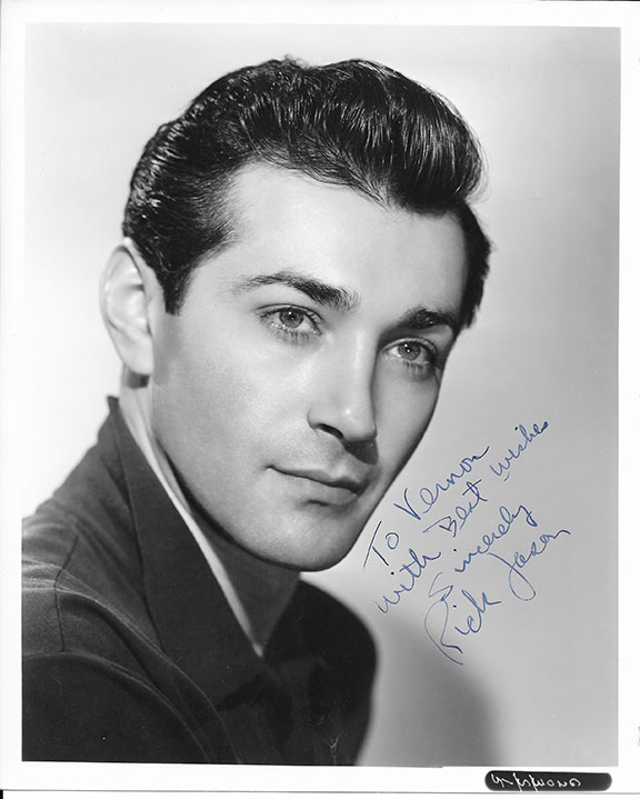 JASON, Rick (1923-2000). American actor. Starred on the ABC Television Series Combat. He appeared in Now I Lay Me Down To Sleep and with Jayne Mansfield in The Wayward Bus (1957). He is the winner of several awards. Vintage photograph, 8’X10”, B&W, head and shoulders pose, full face looking serious. Inscribed and signed using a fountain pen: “To Vernon with Best Wishes Sincerely Rick Jason.’ In near fine condition.........$175.00 ![]() |