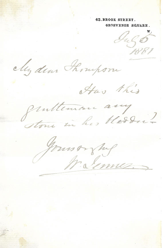 JENNER, Sir Wlliam 1st Baronet (1815-1898). Doctor who discovered the distinction between typhus and typhoid. During 1862, Jenner was appointed Physician in Ordinary to Queen Victoria. In 1863 he was appointed Physician in Ordinary to the Prince of Wales. Jenner attended both the Prince Consort and the Prince of Wales during their attacks of typhoid fever. Autograph letter signed, one page to {Sir Henry} Thompson enquiring about the bearer of this letter. “Has this gentleman any stone in his bladder? Yours truly W. Jenner.” Mounted at corners to an old album page..................$175.00