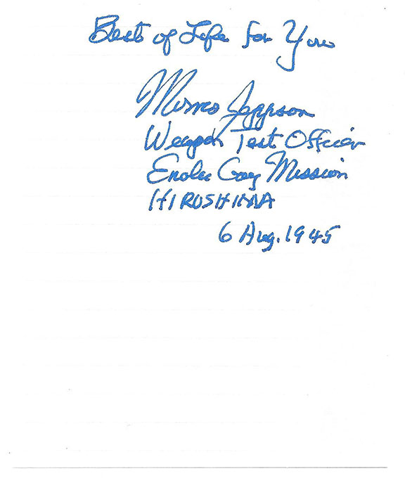 JEPPSON, Morris (1922-2010). Army, Air Force electronics specialist who armed the atomic bomb ”Little Boy” aboard the Enola Gay during its flight from Tinian to Hiroshima. Autograph note signed, on a slip from a note pad. He has written: “Best of Life for You, Morris Jepson, Weapon Test Officer, Enola Gay Mission, Hiroshima, 6 Aug. 1945.” Anything signed by Jeppson can be considered quite uncommon...........$45.00![]() |