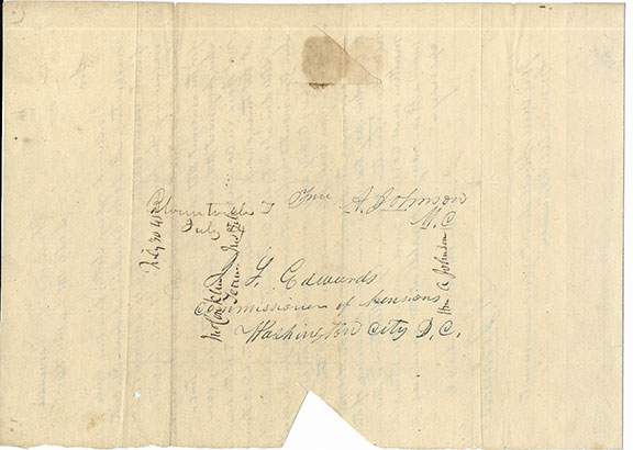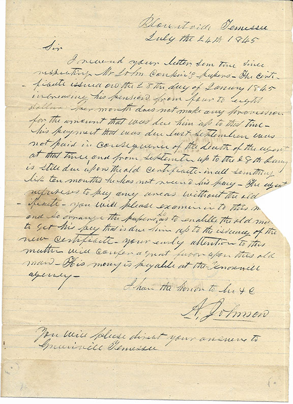 JOHNSON, Andrew (1808-1875). The 17th President of the United States. Assumed the presidency upon the assassination of Abraham Lincoln. He was the first president to be impeached. Johnson owned 10 slaves and brought one of them to the Executive Mansion. Early and very lengthy autograph letter signed, Blountville, Tennessee, July 24th, 1845. Full page, 10.5’x8”. Integral address leaf addressed in Johnson’s hand to the Commissioner of Pensions in Washington City, D.C., bearing Johnson’s free frank, signed “A. Johnson” as a member of Congress. Johnson is seeking help for a constituent, who has not been receiving pension payments due him. Johnson recites the facts in detail and with great clarity. In part he states: “Your early attention to this matter will confer great favor upon this old man.” Signed A. Johnson. A small piece of paper is missing, affecting part of two words but found on the other side with the wax seal. In 1845, Johnson’s second term in Congress he presented himself as the defender of the poor. It is believed that Johnson is one of the scarcest presidents to be found in a.l.s. His free franks have been described as very rare. Both together is extremely desirable.........................$3600.00