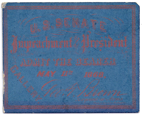JOHNSON, Andrew President and Vice President. On May 16, 1868 he escaped impeachment in the Senate by one vote short of a two-thirds majority. Uncommon ticket for the "U.S. SENATE / IMPEACHMENT OF THE PRESIDENT" trial, dated May 11, 1868. Facsimile signature of George F. Brown, Sergeant-at-Arms. printed in blue with orange ink on heavy blue stock. Tickets for the impeachment proceedings of the 17th President of the United States was a hot item in 1968. The president endured a two month trial on charges of high crimes. Card measures 3"x3.5" and is in good condition. Those who collect these treasures also collect the tickets for the impeachment of Bill Clinton. With these two tickets you will have a complete set...............$250.00