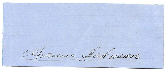 JOHNSON, Andrew (1808-1875) Seventeenth President of the United States. Fabulous ink full signature on blue lined paper...........SOLD