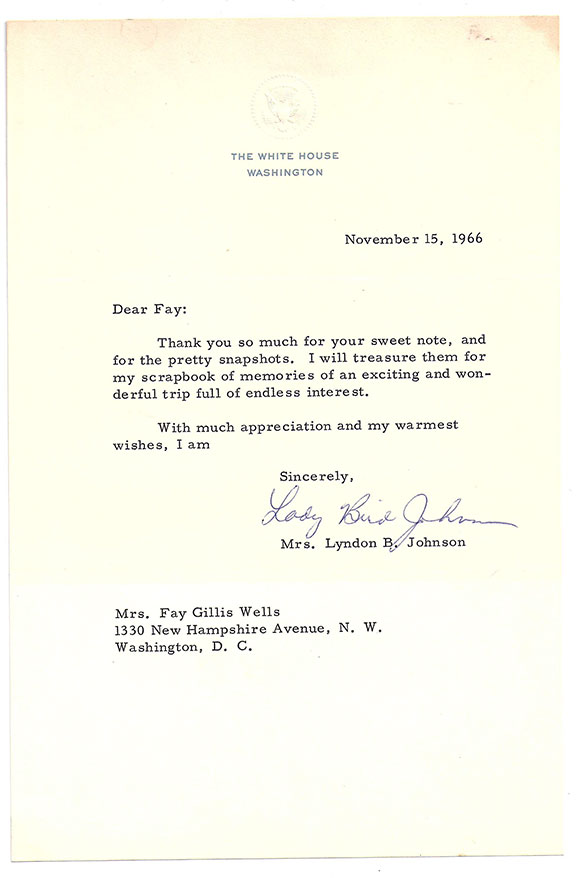 JOHNSON, Lady Bird (1912-2007). First Lady of the United States (1963-69). T.L.S. one page on the imprinted letterhead of The White House, Washington, November 15, 1966. The First Lady writes: “Dear Fay: Thank you so much for your sweet note, and the pretty snap shots. I will treasure them for my scrapbook of memories of an exciting and wonderful trip full of endless interest. With much appreciation and my warmest wishes, I am, Sincerely”. Signed in full...........$100.00 |