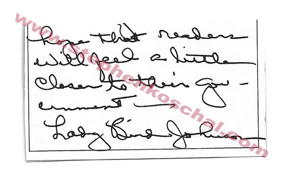 JOHNSON, Lady Bird (1912-2007). First Lady of the United States (1963-69). Very uncommon autograph note signed on a portion of her bookplate. “Hope that readers will feel a little closer to their government, Lady Bird Johnson”...............$135.00![]() |
