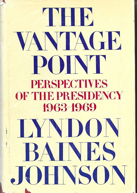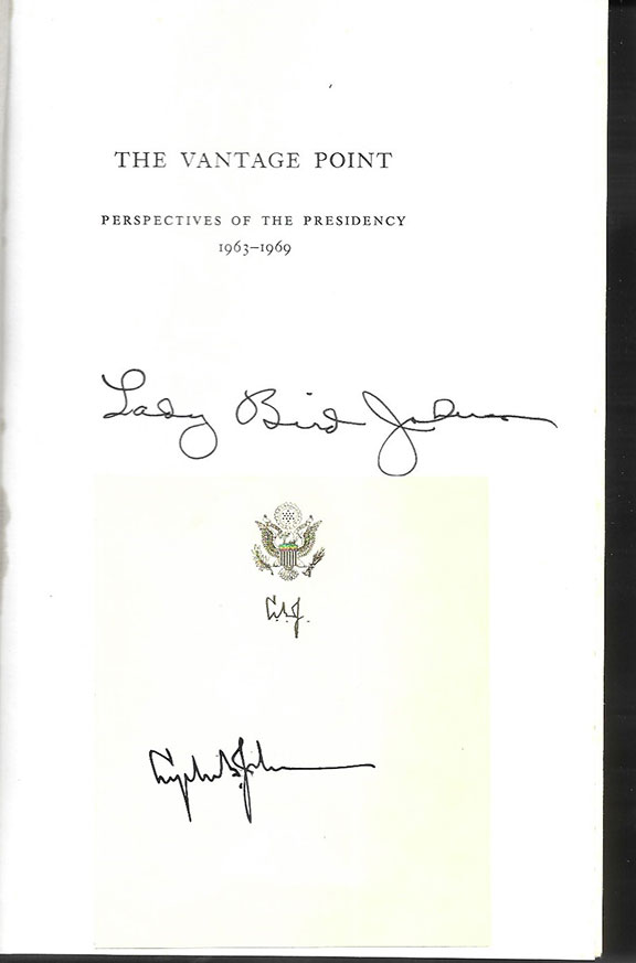 JOHNSON, Lyndon B. (1908-1973). 36th President of the United States. His autobiography, The Vantage Point, Perspectives of the Presidency 1963-1969. Holt, Rinehart & Winston, 1971, First Edition, so stated. On the half title page is his personal bookplate made especially for this book. It has a gilt embossed Presidential Seal and his initials. Bookplate is boldly signed in full by Lyndon B. Johnson. Above the bookplate on the same page, Lady Bird Johnson has signed her name. Most seasoned autograph dealers will tell you that genuine signatures of Lyndon B. Johnson are very difficult to obtain. He used the Autopen machine and secretaries. Many documents are signed with a printed signature. Many books are signed and or inscribed by his secretary. Basically the only way to ensure you have an absolutely genuine signature of Johnson is to obtain one of these bookplates. Much information published about Johnson’s signature is the opinions of the authors and not always accurate. Book in very good condition with a worn but acceptable dust jacket. Nearly impossible to find this book signed by both........$275.00