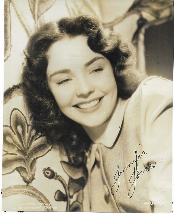 JONES, Jennifer (1919-2009). American actress whose career spanned three decades. Nominated for Academy Award 5 times. Won an Academy Award for Best Actress for “The Song of Bernadette” (1948). She was married to David O. Selznick. She survived a 1966 suicide attempt. Attractive paramount Pictures photograph,7.5”x9.25” head and shoulders pose smiling. Very boldly signed. Some mounting traces on verso otherwise in fine condition.....................SOLD![]() |