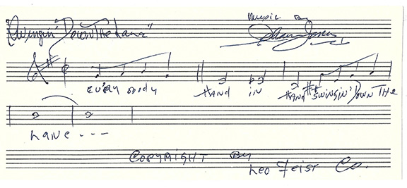 JONES, Isham (1894-1956). U.S. Bandleader, violinist, bassists and songwriter. His compositions include “Swingin Down The Lane” which was #1 for 6 weeks in 1923. “Ill See You In My Dreams” (1924), “It Had To Be You” (1924), and “There Is No Greater Love” (1936). Jones was inducted into the Big Band and Jazz Hall of Fame and The Songwriters Hall of Fame. AMuQs, Jones has penned two lines of music and the words to his hit “Swingin Down The Lane” on printed music paper measuring 3.5”x9”. Boldly signed. Autographs of Jones are uncommon in any form..............................$275.00