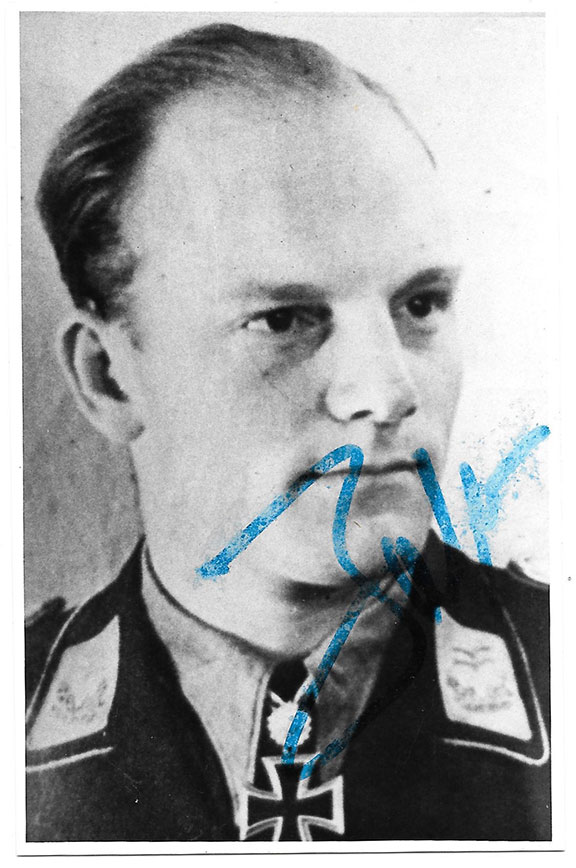 JOSTEN, Oberleutnant Gunther (1921-2004). German fighter pilot during WWII. Flew with the JG-51. Ace, credited with 178 victories. Awarded the Knight’s Cross with Oak Leaves. Photograph, 3.5”x5”, B&W, head & shoulders pose in uniform. Boldly signed with very good contrast. A bit of smudging to his signature..... $95.00 |