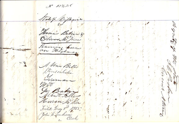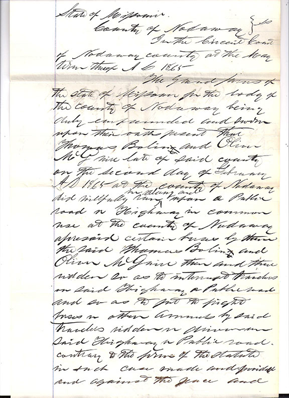 PARKER, Isaac C. (1838-1896). Circuit Court judge who appointed 200 Marshalls which 65 were killed. Parker passed 162 death sentences at Ft. Smith. Parker is best known as “The Hanging Judge.” Autograph document signed, small folio, one page plus, Nodaway, Co., Missouri. Filed, May 3, 1865. State of Missouri vs. Thomas Bolin and Oliver McGuire. On the second day of February 1865, Bolin and McGuire did willfully run upon a public road or highway in common use certain horses....and then ridden so as to interrupt travelers on said highway or public road....I.C. Parker, Circuit Attorney.” Boldly written and signed.............. $2,950.00