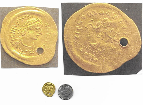 JUSTINIAN I. (483-565 AD.) A devout Christian, one of the most important rulers of the late antiquity. Known as Justinian the Great. Byzantine Emperor who ruled from 527-565 AD. He forbade Jews from reading the Bible in Hebrew. He is considered a Saint by the Eastern Orthodox Christians. Incredible striking coin of the Byzantine Emperor. Gold coin made roughly of 23K fine gold which has amazing preservation of detail. Minted in Constantinople, now Istanbul, the coins denomination is Solidus. This coin has a small hole likely punched in antiquity to be worn by a local elite who used this coin as jewelry. Bust of Justinian, helmeted holding a globus cauciges and shield decorated with horseman motif. On the other side is an angel holding a long staff surmounted by staurogram and globus cruciger, star in right field. Illustration enlarged to show detail. This coin is well over 1,400 years old.........$475.00