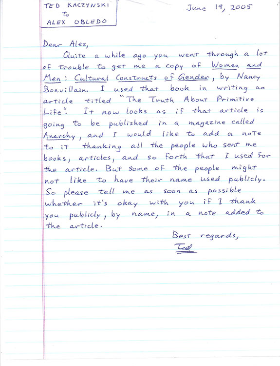 Rare autograph letter signed “Ted” dated June 19, 2005. Kaczynski writes: “Quite awhile ago you went through a lot of trouble to get me a copy of Women and Men: Cultural Constructs of Gender , by Nancy Bonvillan. I used that book in writing an article titled The truth About Primitive Life. It now looks as if that article is going to be published in a magazine called Anarchy, and I would like to ad a note to it thanking all the people who sent me books, articles and so forth that I used for the article. But some of the people might not like to have their names used publicly. So please tell me as soon as possible whether it’s okay with you if I thank you publicly, by name, in a note added to the article..” Signed “Ted”. At the top of the letter he writes: “Ted Kaczynski to Alex Obledo”. In fine condition...............................SOLD