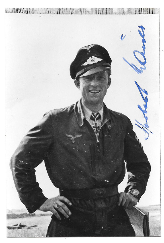 KAISER, Herbert (1916-2003). German fighter pilot during WWII. Flew with the 77, 1, & 44. Awarded the Knight’s Cross of the Iron Cross. Ace credited with 68 victories. Kaiser was captured by American Troops in May 1945. Photograph, 3.5”x5”, B&W, half left pose in wearing his leather flight jacket. Boldly signed with excellent contrast................................ $47.50 |