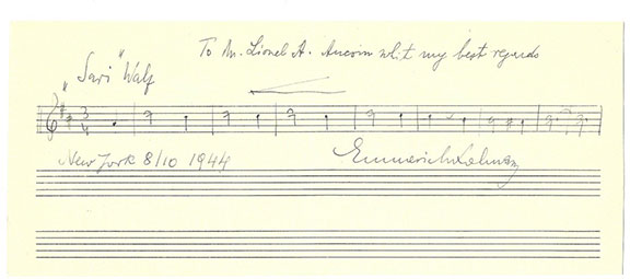 KALMAN, Emmerich (1882-1953). Hungarian born of a Jewish family. Composer of Operettas. Along with Lehr, he was a leading composer of what is called “The Silver Age” of Viennese Operetta. Despite his Jewish origin, he was one of Hitler’s favorite composers. Kalman rejected Hitler’s offer to become an “Honorary Arian” therefore he was forced to move to Paris. AMuQS, Kalman has penned one line of music from the waltz “Sari” which was played at the New Amsterdam Theatre on 42nd St. New York. Sari was a musical revival on January 29, 1930 at the Liberty Theatre on 42nd Street. Inscribed: To Mr. Lionel A. Aucoin with my best regards, Emmerich Kalman, New York, 8/10/1944.” In very fine condition.........395.00