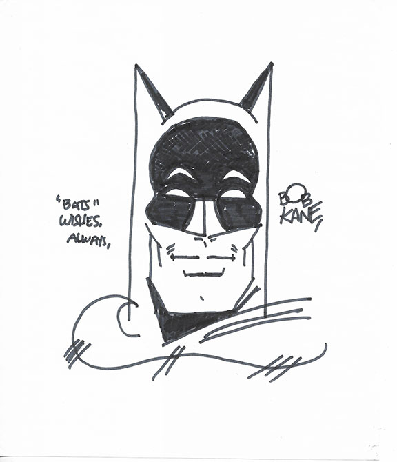 Bob Kane created the crime-fighter, the Batman, in the spring of 1939, along with writer Bill Finger. Today, Batman is considered one of the greatest comic characters in history. Original sketch of the head of Batman, 7.5”x9” using a bold ink Sharpie pen. Kane has written a very nice inscription: “Bats Wishes Always” and has signed his name “BOB KANE. Beware of Batman sketches that come with a COA originating from Chicago. In very fine condition ready for the perfect frame.....................SOLD