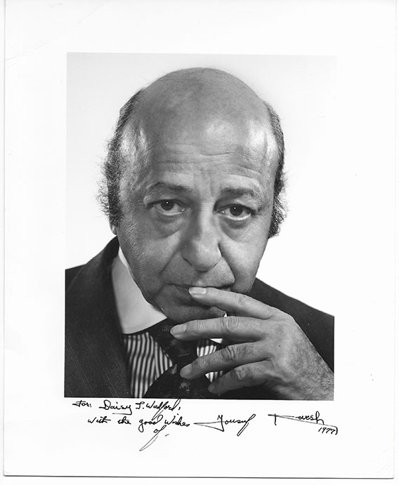 KARSH, Yousuf (1908-2002). Armenian born. Known as one of the most famous and accomplished portrait photographers. Photograph, black & white, 8”x10” head and shoulders pose looking quite serious. Inscribed on the lower white margin: “For Daisey T. Wadford, with the good wishes of Yousuf Karsh, 1977. A few minor creases in the left margin, not affecting and of the writing or portrait.......$185.00