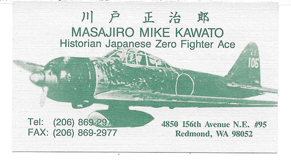 KAWATO, Masajiro “Mike” (1925-2008). Japanese Zero Pilot who had 19 kills and suffered 17 wounds. During his lifetime he was considered by many Japanese as Japan’s greatest WWII Ace. He downed the Black Sheep Squadron’s leader Pappy Boyington on January 2, 1944. Boyington was picked up by a Japanese submarine and held prisoner until war’s end. Kawato’s business card where he has written on the verso: “Masajiro Mike Kawato, Japanese WWII Ace, 19 Victories Shot down Col. Greg Pappy Boyington.” Most unusual and in excellent condition...............................SOLD
