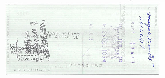 KAWATO, Masajiro (1925-2008). Japanese Zero Pilot, who had 19 kills and suffered 17 wounds. During his lifetime was regarded by many as Japan’s greatest WWII Ace. He downed the Black Sheep Squadron’s leader Pappy Boyington on Jan. 3, 1944. Boyington was picked up by a Japanese Submarine and was held a prisoner until war’s end. Check made out to Masajiro M. Kawato, April 23, 1992 for $24.00. Endorsed on the verso by Kawato, adding his bank account number. In fine condition..................$35.00