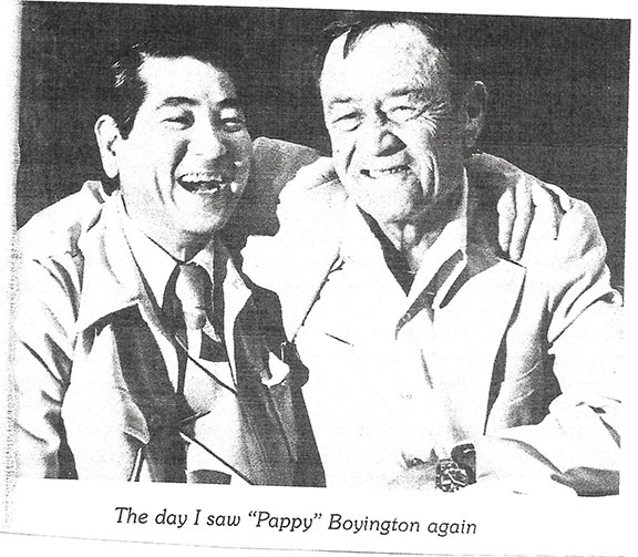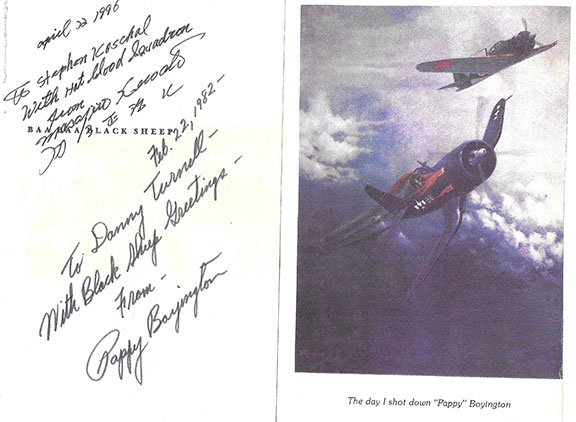 BOYINGTON, Col. Gregory “Pappy” (1912-1988). American fighter pilot during WWII. USMC, he flew with the Flying Tigers. He was the leader of the Black Sheep Squadron. An Ace he is credited with a confirmed 28 victories. He received both the Medal of Honor and the Navy Cross. Offered is a genuine page from Boyington’s book Baa Baa Black Sheep. Inscribed, signed and dated by Pappy Boyington: “Feb.22, 1982- To Danny Turnell- with Black Sheep Greetings- From- Pappy Boyington.” Above on the same page is the following writing in Mike Kawato’s hand: “April 22, 1996 To Stephen Koschal with Hot Blood Squadron from Masajiro Kawato.” Signed once again just below in Japanese. Throughout the years very few items could be found signed by both Aces on the same item. Together with a portrait of Kawato and Boyington and a color portrait of Kawato shooting down Pappy Boyington. A perfect grouping to be matted and framed. RARE..................................$595.00 ![]() ![]() |