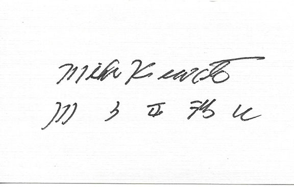 KAWATO, Masajiro (1925-2008). Fighter pilot with the Imperial Japanese Navy. He flew 35 combat missions. Great Japanese WWII Ace. Credited with 19 victories. Shot down Col. Gregory “Pappy” Boyington which was Kawato’s 13th victory. Kawato was shot down 5 times. The last time he was shot down he landed in the sea and was captured and delivered to an Australian POW camp. Kawato was declared dead by the Japanese military and a funeral was held. Three and one half years later he returned home and visited the altar where his funeral services were held. Tom Bradley, Mayor of Los Angeles awarded Kawato a special commendation for courageously spanning the Pacific Ocean in a solo flight from Tokyo to Crescent City, California. The flight covered more than 5,000 miles in thirty-five hours and 15 minutes. This flight established a goodwill gesture between Japan and the United States. Kawato’s scarce business card, signed both in English and Japanese on the verso. In excellent condition ............$150.00