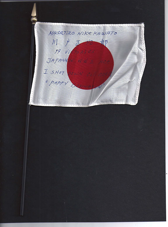 KAWATO, Masajiro (1925-2008). Japanese Zero Pilot, who had 19 kills and suffered 17 wounds. During his lifetime was regarded by many as Japan’s greatest WWII Ace. He downed the Black Sheep Squadron leader Pappy Boyington on Jan. 3, 1944. Boyington was picked up by a Japanese Submarine and was held a prisoner until war’s end. Japanese flag measures appx: 4”x5”. Signed on the flag: “Masajiro Mike Kawato (signed once again in Japanese) 19 victories, Japanese WWII Ace, I shot down Col. Greg. Pappy Boyington”. Framed, this flag would make an excellent presentation........................... SOLD