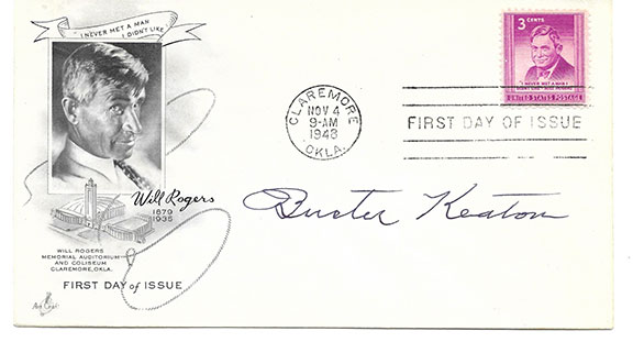 KEATON, Buster (1895-1966). American comic actor, film producer and writer. Best known for his silent films. First Day of Issue Cover commemorating Will Rogers. Cachet of Will Rogers and affixed to this cover is a U.S. 3 cent Will Rogers postage stamp cancelled First Day of Issue, Claremore OKLA. Nov 4, 1948. Choice signature of Buster Keaton. In fine condition.................$450.00 |