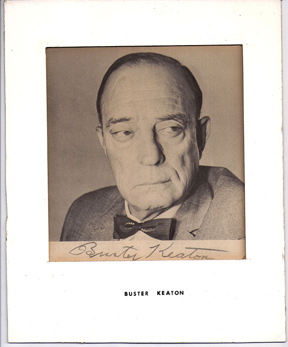 KEATON, Buster (1895-1966). One of the most sophisticated of the great silent film clowns. Film Director. He received a special Oscar in 1959. Magazine portrait, head & shoulders full face pose, looking quite sad. Very boldly signed using a pencil with thick lead. Excellent contrast and quite scarce as such. Very difficult to find a signed portrait of Keaton in such fine condition............... $575.00