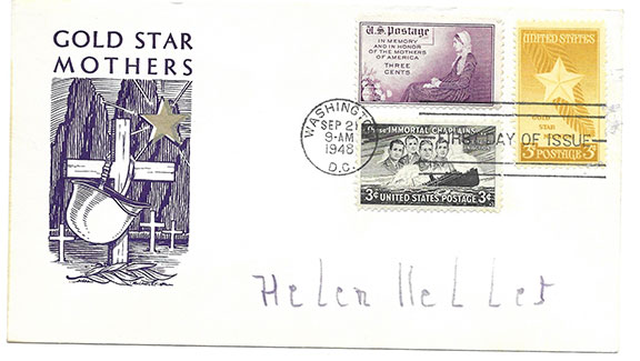 KELLER, Helen (1880-1968). Author, political activist. She was the first deafblind person to earn a college degree (Radcliff College). First Day of Issue cover, honoring Gold Star Mothers. Cachet of a cemetery with crosses. Hanging from a cross is a U.S. military helmet. Affixed to this cover is three U.S. 3 cent postage stamps cancelled First Day of Issue, Washington D.C. SEP 20, 1948. Choice pencil signature of Helen Keller in a clear area of the cover. In fine condition.......$595.00
