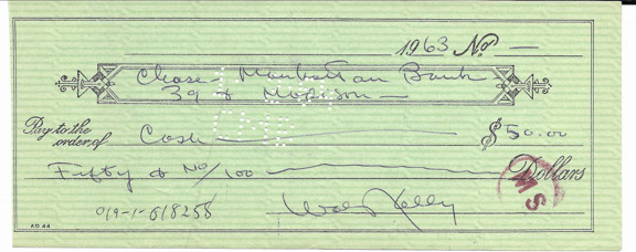 KELLY, Walt (1913-1973) American animator and cartoonist. Best known for his comic strip Pogo. He began his animation career at Walt Disney Studios in 1936. He contributed to Pinocchio. Fantasia and Dumbo. Later he created Pogo while working at Dell Comics. Check accomplished all in the hand of Kelly. 1936, Chase Manhattan Bank 39 & Morison, made out to Cash for $50 and signed Walt Kelly. Red bank stamp not affecting any writing........................$165.00 |
