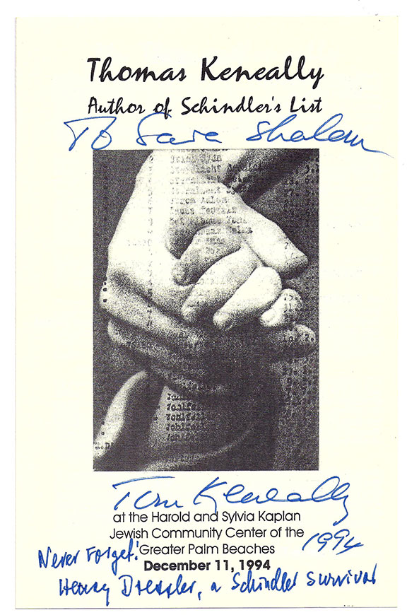 Program for a ceremony held in Palm Beach, Florida on December 11, 1994. Printed at the top of the cover is “Thomas Keneally Author of Schindler’s List”. Portrait of two clasped hands in the center. The author has inscribed and dated as follows: “To Steve, Shalom Tom Keneally, 1994”. Just below Dressler has written: “Never Forget! Henry Dressler, a Schindler Survivor”. Mr. Dressler’s name is listed as the “Special Guest” inside the program. A wonderful pair of Holocaust related signatures...........SOLD