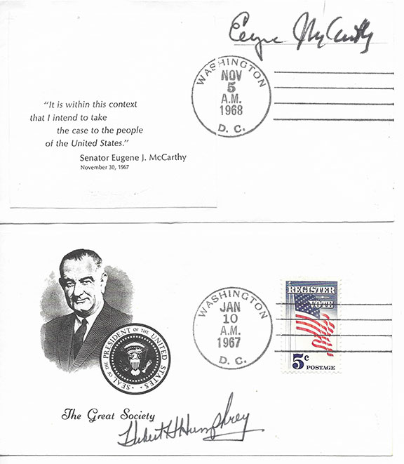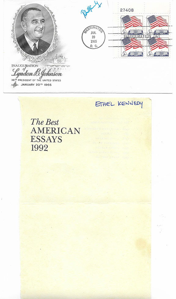 KENNEDY, Robert F. (1925-1968). U.S. Attorney General for President John F. Kennedy (1965-1968). Assassinated. First Day cover commemorating the Inauguration of Lyndon B. Johnson. Fine cachet of LBJ. Affixed to this cover is a plate block of the 5 cent American Flag stamps. Cancelled Washington Jan 20, 1965 D.C. Signed with a wonderful green ink signature by Robert F. Kennedy. Note on verso states RFK signed with Senator Bartlett’s blue pen. McCARTHY, Eugene (1916-2005). U.S. Senator who sought the Democratic presidential nomination election. RFK faced two rival candidates, Eugene McCarthy, and Hubert Humphrey. Cover with a printed statement by McCarthy, boldly signed by McCarthy with a large franking signature cancelled Washington, D.C. Nov 5, 1968. Fine condition. HUMPHREY, Hubert (1911-1978) 38TH V/P of the United States (1965-1969). Choice cover commemorating Lyndon Johnson. Portrait of Johnson and the Great Seal of the President. Affixed is a U.S. 5 cent Register to Vote stamp cancelled Washington, D.C. Jan 10, 1967. Boldly signed by Hubert Humphrey as Vice-President of the United States. All three items in fine condition. KENNEDY, Ethel ((1928- ) American actress, appeared in Cheer (1982) and Ethel (2012) . Many wonder if she is being stalked by a deadly curse. Both her parents were killed in a plane crash (1955), she was a sister-in-law to JFK who was assassinated, she is the widow of Robert F. Kennedy who was assassinated, she had eleven children with him. In 1984 she lost her son David because of a drug overdose and in 1997 her son Michael died in a skiing accident. Scarce, genuine signature at the top of a half title page to a book from her library. She printed out her name as usual to indicate ownership of the book. Not a common signature. In excellent condition. The collection of four items.....................$875.00 ![]() ![]() |