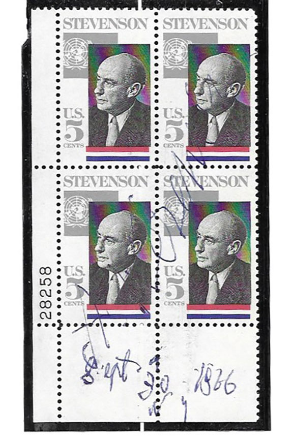 ERICSSON, John (1803-1889). Swedish-American engineer. Designer of the KERENSKY, Alexander Feodorovich (1881-1970). Leader in the Russian Revolution of 1917. After the revolution that overthrew the Czar in March 1917, Kerensky was the only Socialist member of the first Provisional Government. He was Minister of Justice, Minister of War and finally Prime Minister. The Communist Bolsheviks overthrew Kerensky’s government on November 7, 1917. He fled Russia. Plate lock of four U.S. 5 cent Adlai Stevenson postage stamps. Signed and dated across the stamps: “A. Kerensky Sept.30, 1966.” Signatures of Kerensky are scarce in any form...........................SOLD