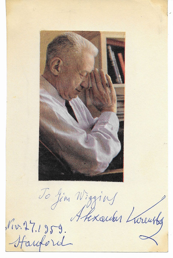 KERENSKY, Alexander (1881-1970). Russian Revolutionary and leader who led the 1917 revolution. Served as President of the Russian Provisional Government until it was overthrown by the Bolsheviks, Vladimir Lenin. Kerensky spent the rest of his life in exile. Card measuring 4”x6”, affixed is a color portrait of Kerensky, side view with his hands clasped in prayer. In his hand he has written: “To Jim Wiggins Alexander Kerensky, Nov.27,1959. Hartford.” In very good condition and rather scarce in any form.....................$495.00