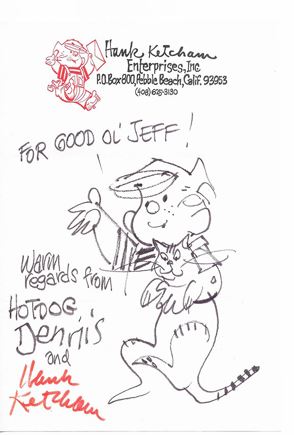 KETCHUM, Hank (1920-2001). Animator for Walter Lantz and Walt Disney. He worked on Pinocchio, Bambi and Fantasia and Donald Duck. He created Dennis the Menace (1951-1994). His son ‘Dennis” was estranged for much of Dennis’s adult life. Fabulous sketch of Dennis the Menace holding his cat on Ketcham finest stationery. Measures 6”x8”, inscribed: “For Good ol’ Jeff! Warm regards from Hotdog, Dennis and Hank Ketcham”.......................$175.00![]() |