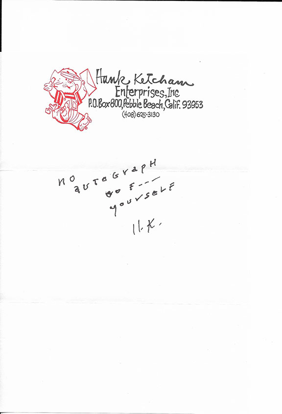 KETCHUM, Hank (1920-2001). Animator for Walter Lantz and Walt Disney. He worked on Pinocchio, Bambi and Fantasia and Donald Duck. He created Dennis the Menace (1951-1994). His son ‘Dennis” was estranged for much of Dennis’s adult life. Extremely unusual autograph note signed with initials, most likely to a very disturbed person acting as a fan. Written on his colorful stationery with a printed portrait of Dennis, Ketcham writes: “no autograph go f_ _ _ yourself H.K.” Obviously Ketcham was very upset writing this note. Mailing folds otherwise in excellent condition........$95.00