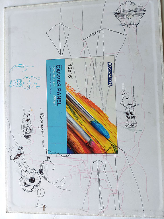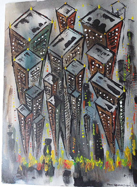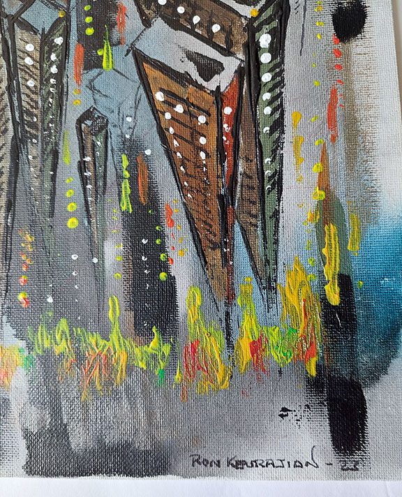 Keurajian, Ron. Attorney, banker, autograph expert, author and artist. He is the author of dozens of articles and studies on baseball and vintage golf autographs for such magazines as Forbes, Autograph Quarterly and Sports Collectors Digest. His recent four hundred- and five-page book Collecting Historical Autographs What to Buy, What to Pay, and How to Spot Fakes is award winning. We are pleased to be chosen to handle the artwork by artist Ron Keurajian. His painting “Crowded Skyscrapers” on a 12”x16” artist board is quite colorful, busy and all the light in the offices seem to illuminate the entire work of art. Signed and dated at the bottom right corner “Ron Keurajian 23.” On the verso the artist has practiced drawing several looking aliens. In fine condition...........$195.00