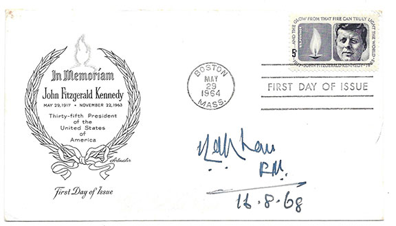 KHAN, Muhammad Ayub (1907-1974). Pakistan politician, 5 Star Rank general and self-appointed Field Marshall in the Pakistan Army. He was the first military dictator. Second president of Pakistan (19958-1969). First day over commemorating the U.S. 5 Cent John F. Kennedy postage stamp. Cancelled, Boston, May 29, 1964, Signed as President. “M.A. Khan, F.M. 16.8.68.” A desirable autograph...........................$135.00