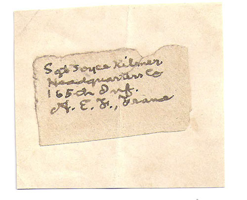 KILMER, Joyce (1886-1918).  American poet, author of Trees.  Killed in action in WWI. Choice signature as Sgt. Joyce Kilmer adding his address as “Headquarters Co. 165th Inf. A.E.F. France” cut from an envelope. Very scarce signature....SOLD