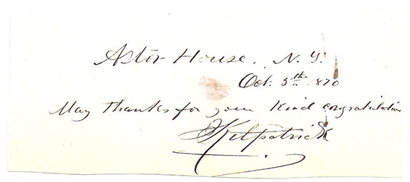 KILPATRICK, H.J. (1836-1881). Union General, commanded Sherman’s Cavalry. Autograph note signed, one page on a small slip. Astor House, N.Y. Oct.5th, 1870. “Many thanks for your kind congratulations. J. Kilpatrick”. V/G..................... $325.00 |