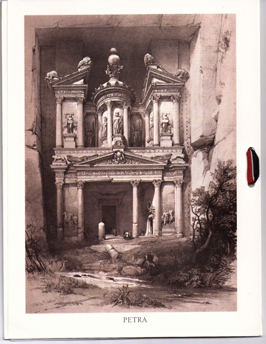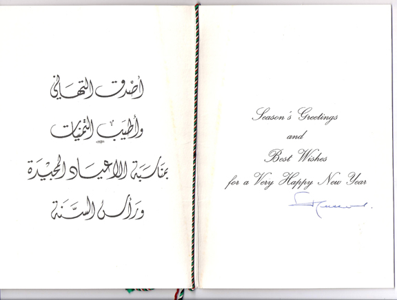 HIS ROYAL MAJESTY KING HUSSEIN I OF JORDAN.  (1935-1999). King of Jordan (1952-1999). He is remembered for guiding his country through turmoil to become an oasis of peace in the Middle East. He is known as the “Father of Modern Jordan” and “The Human King”.  Hussein is a direct descendent of the Prophet Muhammad.  His greeting card wishing “Season’s Greetings and Best Wishes for a Very Happy New Year”. Signed “Hussein” on the inside panel. Printed in Beirut 1968. On the cover is a color reproduction of David Roberts March 30th 1839 Entrance to Petra.  The back cover depicts the King’s Crown. A small amount of paper loss a half inch below the King’s signature not affecting the general appearance otherwise in fine condition ...............................$295.00