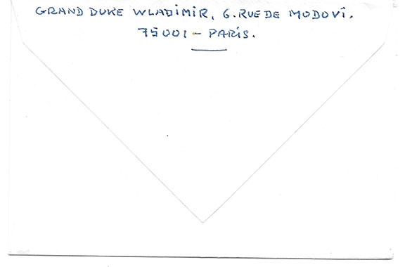 WLADIMIR KIRILLOVICH ROMANOV OF RUSSIA (1917-1992). Grand Duke of Russia, claimed head of the Imperial Family of Russia and Titular Emperor & Autocrat of all Russians from 1938until his death. In 1942 he was placed in a concentration camp. After Germany’s defeat he lived in Austria in the American Occupation Zone. Hand addressed envelope by Vladimir. Cancelled, Paris, Dec. 11, (19)89. On the verso he has printed his name (as Grand Duke Wladimir) and return address. A very scarce autograph.................... $175.00