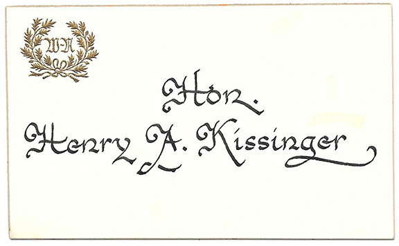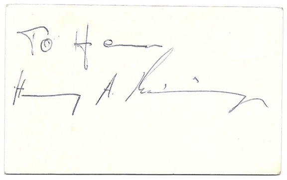 KISSINGER, Henry (1923- ) President Nixon appointed Kissinger the 56th Secretary of State. Kissinger worked under the shadow of Watergate. He was called a war criminal yet he was the recipient of the 1973 Nobel Peace Prize. When President Richard Nixon resigned the presidency, his resignation letter was addressed to Henry Kissinger. Fabulous non-rushed inscription and signature, in ink, on the back of a table card from the Waldorf Astoria Hotel in new York City. The card reads “Hon. Henry A. Kissinger” in calligraphy. A choice genuine signature of Kissinger. Quite a few signatures of Kissinger that have appeared on the market are not genuine... SOLD